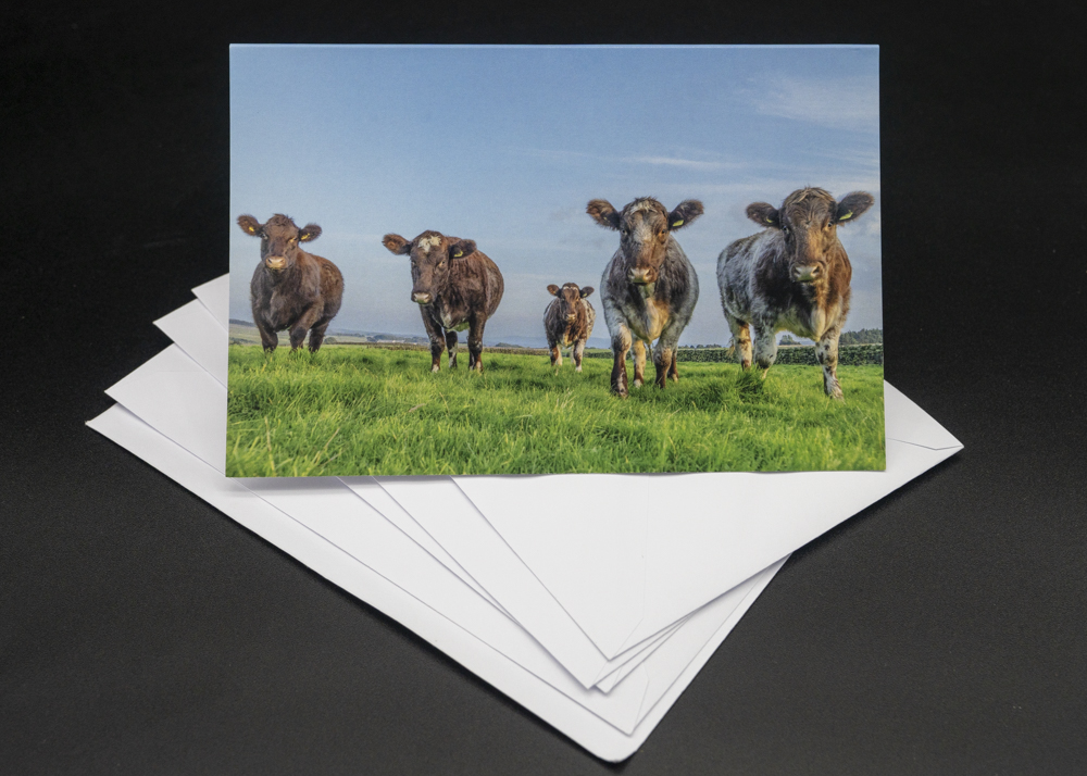 Greetings card with curious Beef Shorthorn cows.