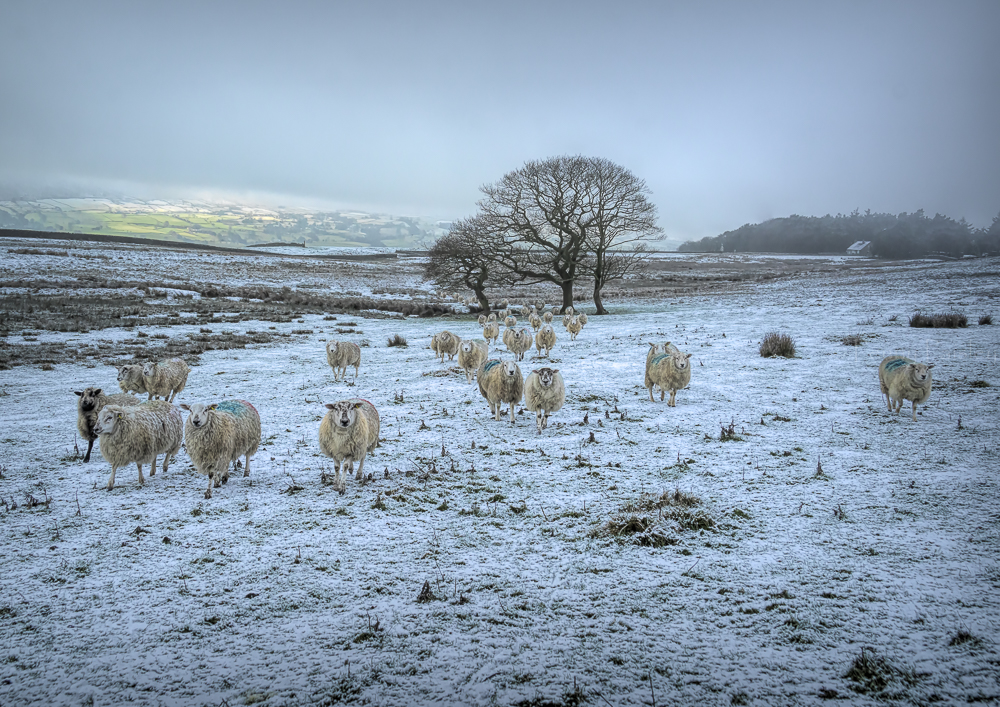 An evocative wintery scene from Langbar, Ilkley with sheep running to greet their shepherd. In the background, Addingham Moorside is lit up with a single shaft of light.