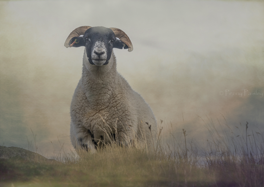 A Scottish Blackface sheep on the misty, atmospheric Isle of Harris in the Outer Hebrides.
